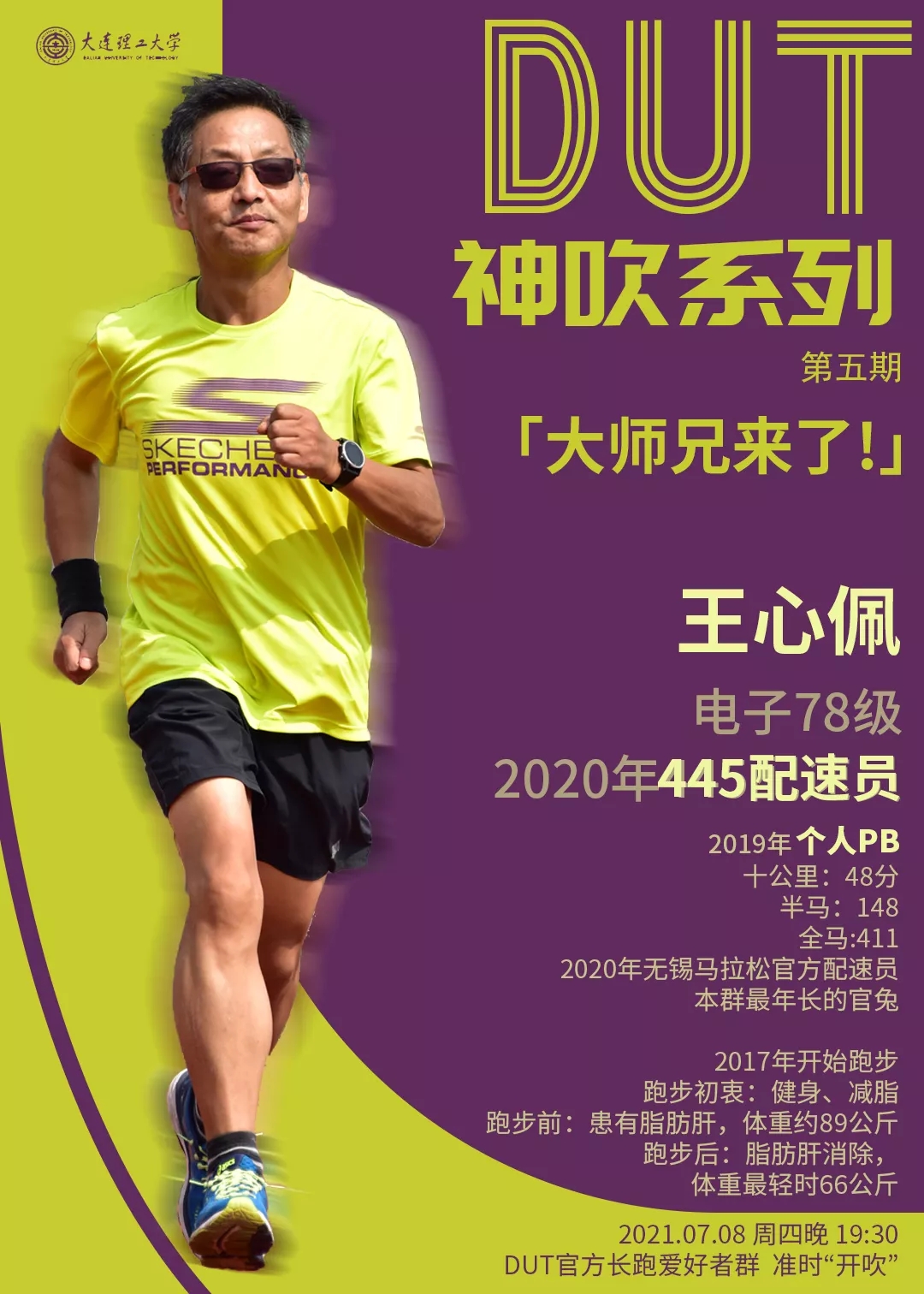7月8日,“DUT神吹之大神有话说”第五期在线上成功举办。本期由跑友会最年长的电子系1978级王心佩校友为大家进行跑步减脂经验的分享。
