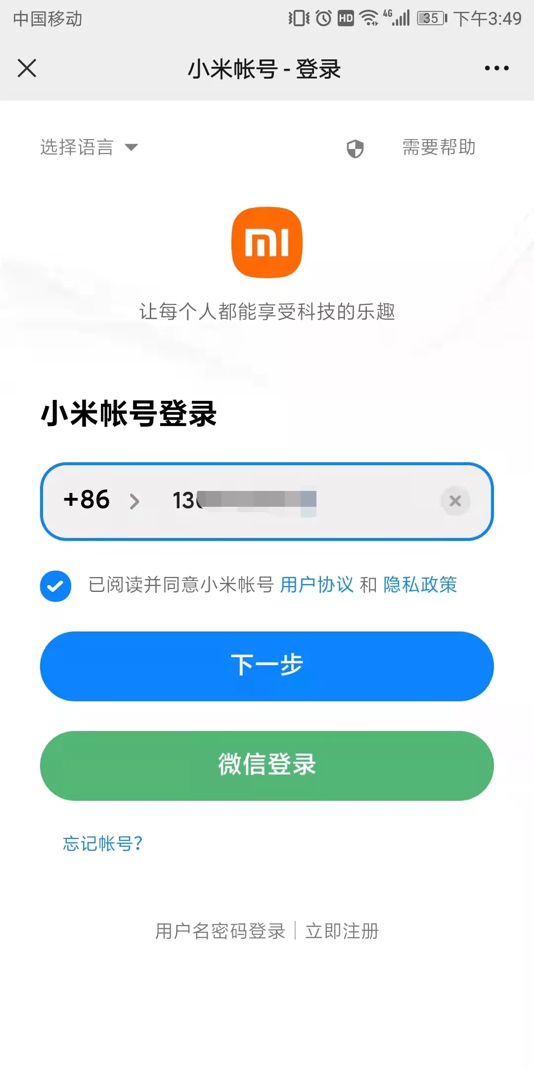1.勾选“已阅读并同意小米账号用户协议和隐私政策”。